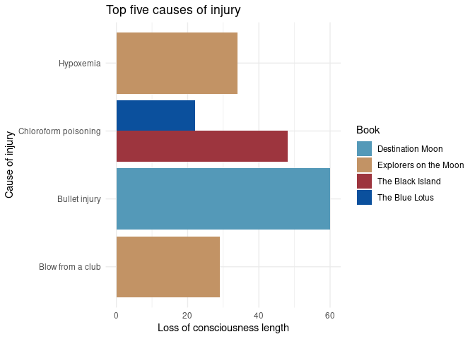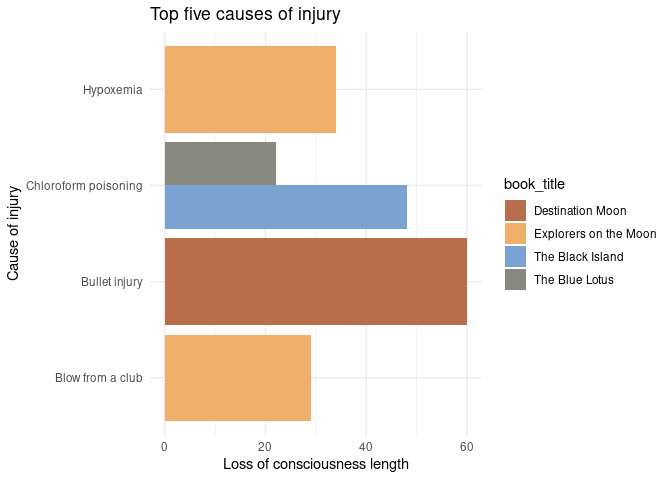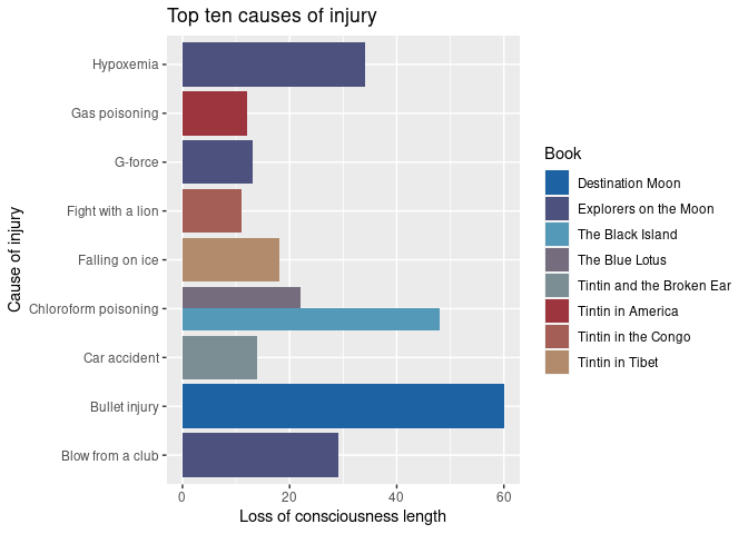 What happens if we need more colours than 5? The functions in the package can fix that. We’ll plot the top ten causes of injury.