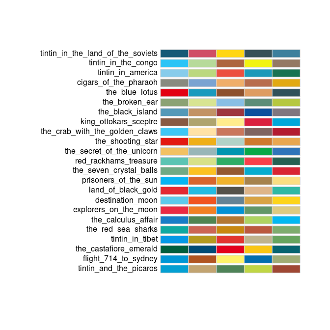 The goal of tintin is to provide palettes generated from Tintin covers. There is one palette per cover, with a total of 24 palettes of 5 colours each. Includes functions to interpolate colors in order to create more colors based on the provided palettes.