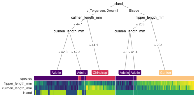 treeheatr incorporates a heatmap at the terminal node of your decision tree. The basic building blocks to a treeheatr plot are (yes, you guessed it!) a decision tree and a heatmap.