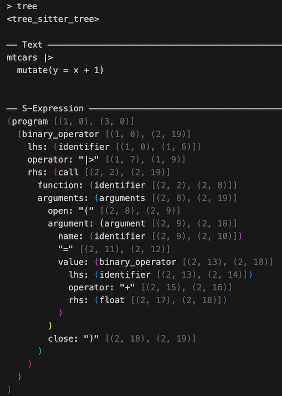 treesitter provides R bindings to tree-sitter, an incremental parsing system. It can build a concrete syntax tree for a source file and efficiently update the syntax tree as the source file is edited. tree-sitter is useful for a number of things, including syntax highlighting, go-to definition, code reshaping, and more.