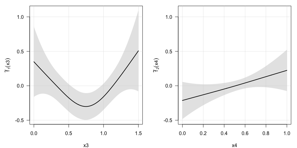 plot(model, select=c(3,4), pages=1) ## Last 2 additive terms in the model