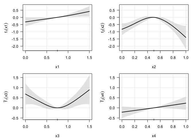 plot(model, select=1:4, pages=1) ## The 4 additive terms in the model