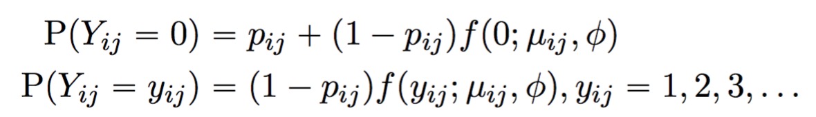 A point mass at zero is added to the distribution to account for dropout. The result is the probability mass function for the zero-inflated negative binomial distribution: