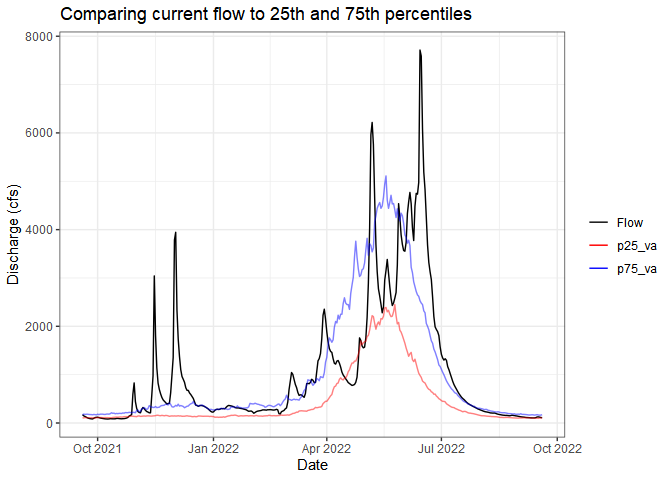 labs(y = 'Discharge (cfs)', color = '', title = 'Comparing current flow to 25th and 75th percentiles') +
