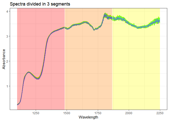 For years now, researchers have been questioning if spectra in its entirety could be less useful than selecting only smaller regions which might produce better predictions. From this, the intent of this package, which aims at dividing spectra in windows, which are used in PLS as predictors and then compared to the complete spectra, to see if there are improvements. In this package there are three possible modes: