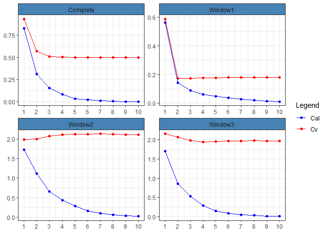 Now, to compare the four possible models, we can plot RMSE of calibration and cross-validation for each of them, in a single window: